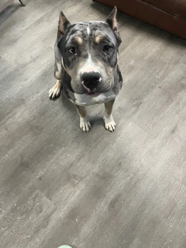 XXL Blue American Bully male puppy, distinguished by a striking thin white stripe elegantly running down his forehead.