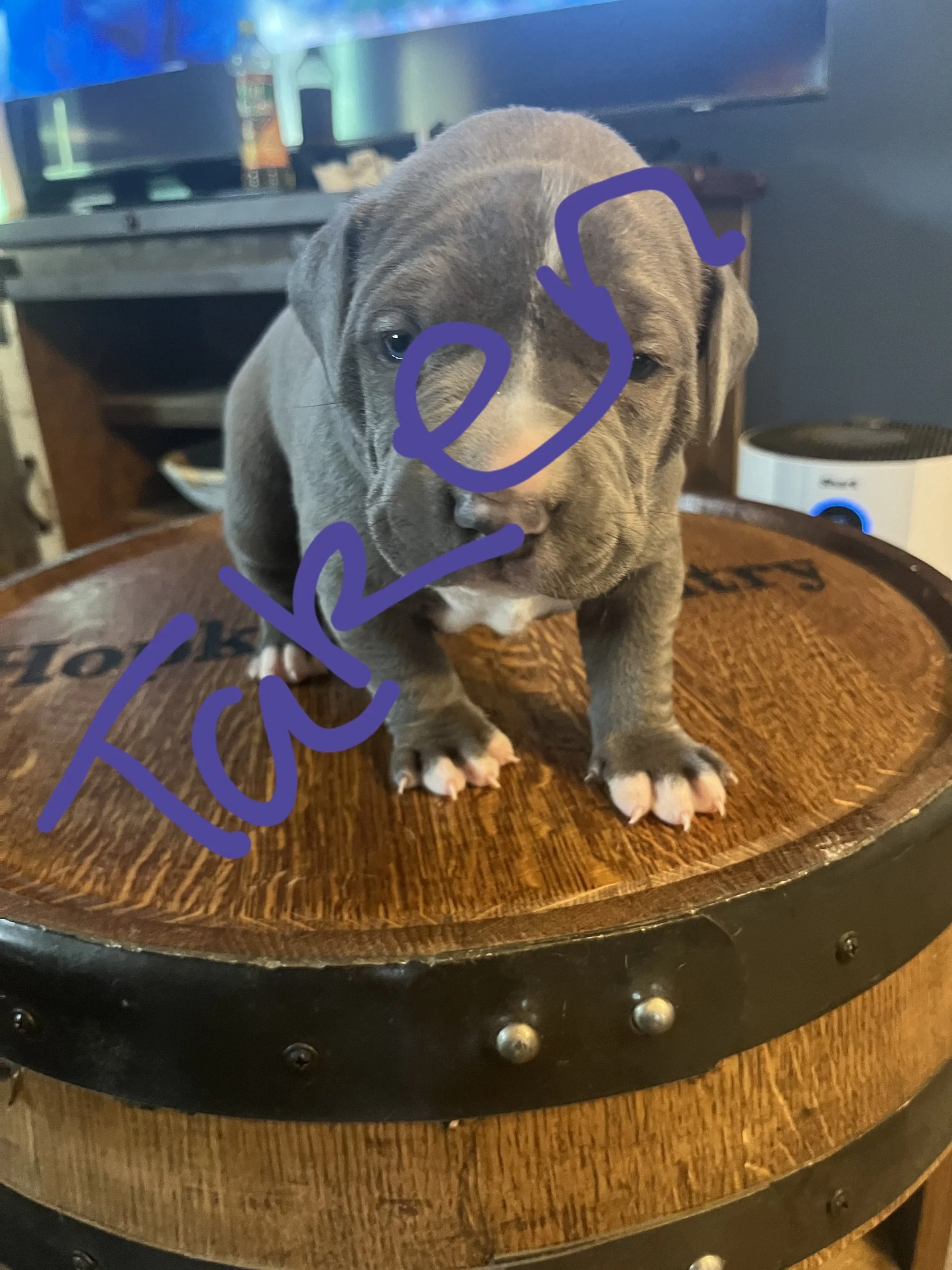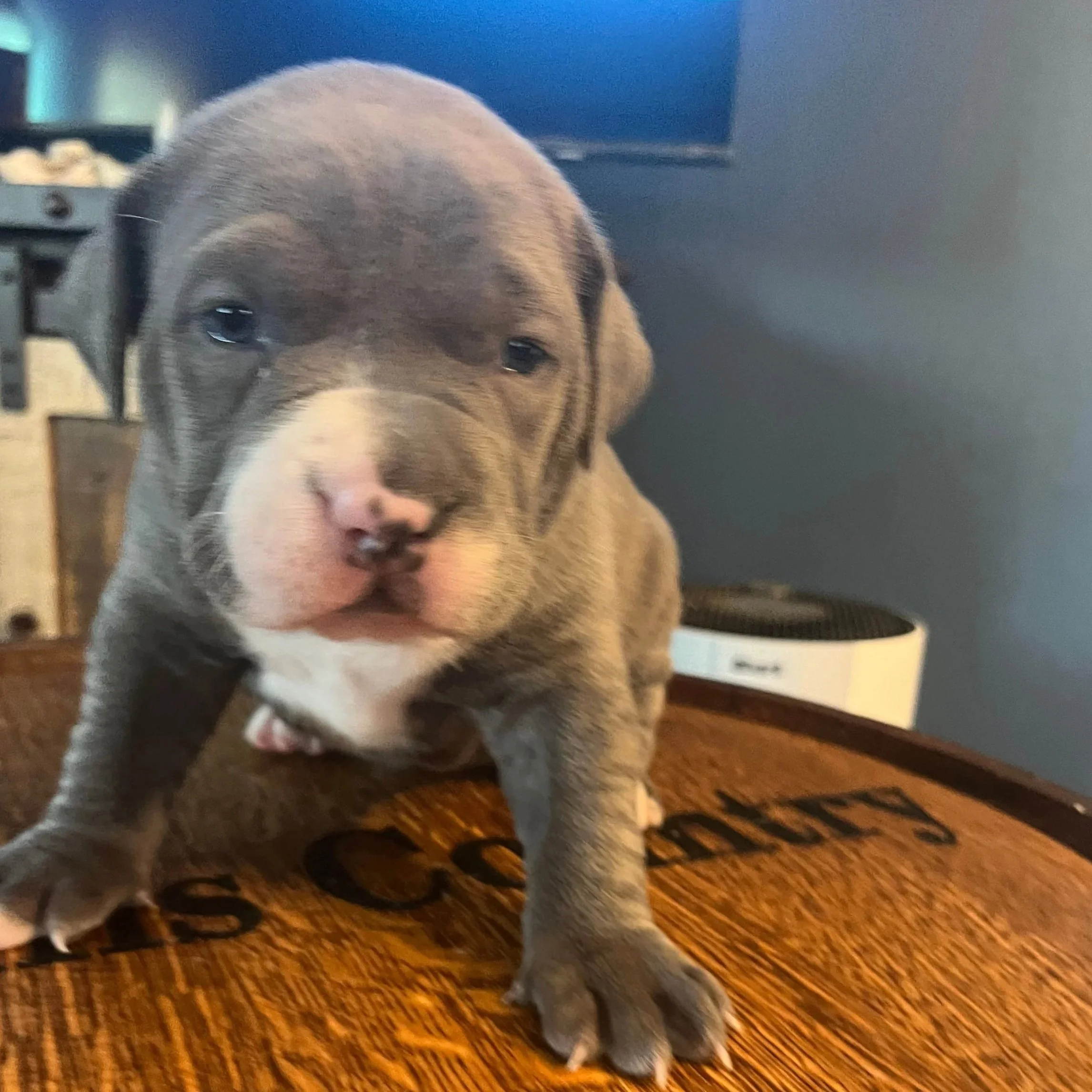 XXL American Bully female puppy boasts a striking blue coat complemented by a captivating white and blue face.