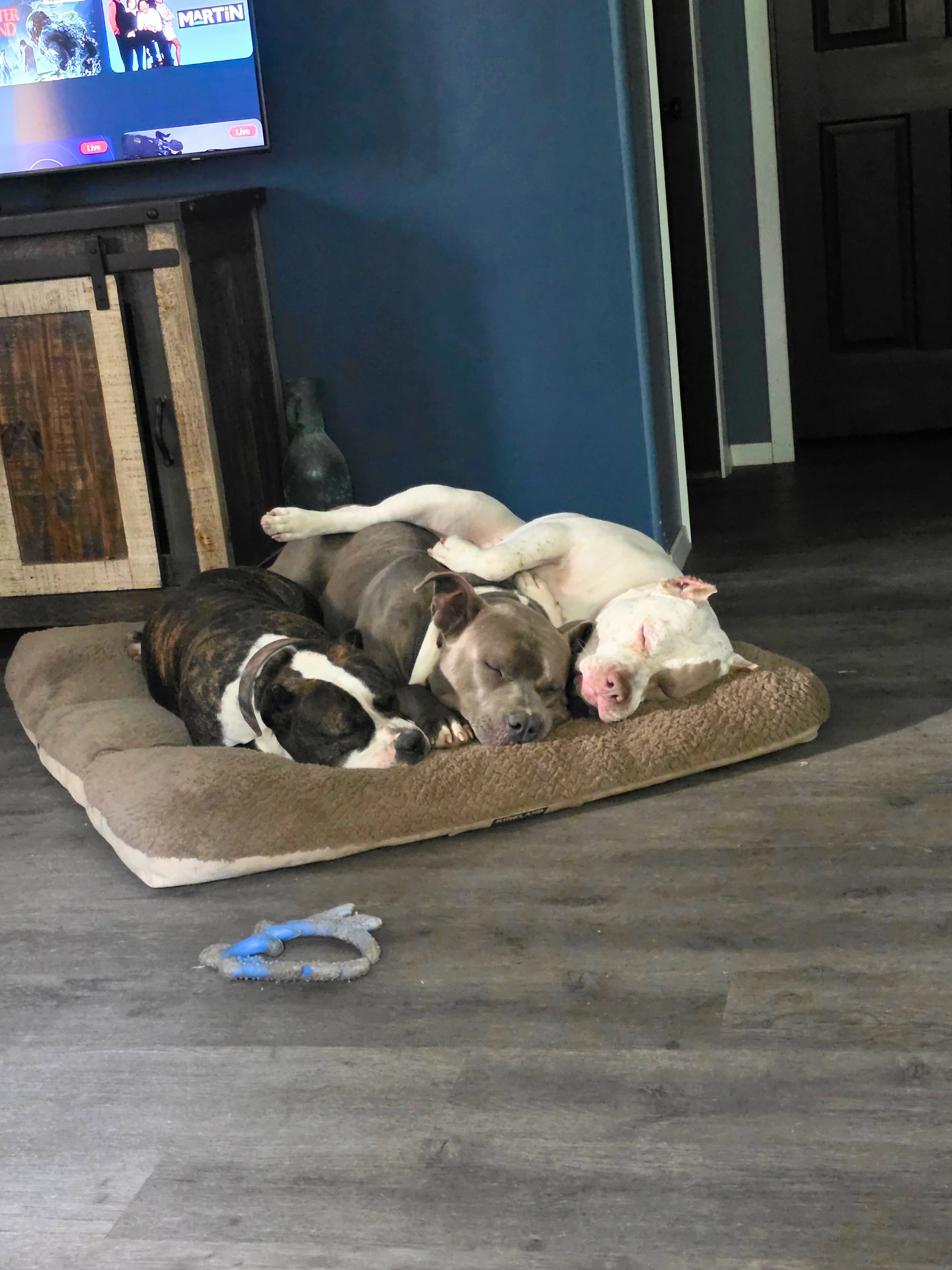 XXL American Bully puppy features a striking white coat accented with unique blue patches, giving her a truly eye-catching appearance.